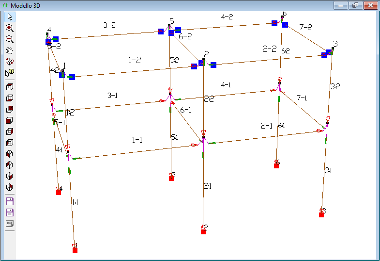 Visualizza la struttura in 3D. Ogni trave o pilastro è rappresentato con un segmento. I tratti infinitamente rigidi utilizzati per modellare il nodo sono rappresentati con segmenti di colore magenta.