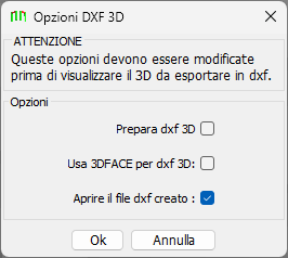 •Prepara dxf 3D. Se selezionato è possibile esportare il 3D in formato dxf tramite il pulsante