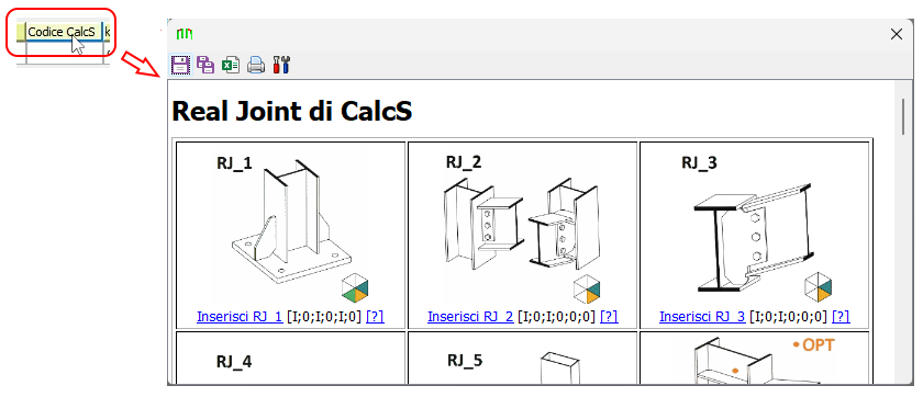 •Codice CalcS: Codice del giunto del software CalcS (www.calcs.it) che esegue le verifiche delle unioni in acciaio. Cliccando Codice CalcS si apre una finestra che mostra i vari tipi di giunti disponibili in CalcS. Cliccando sul link "Inserisci RJ_N" i parametri del giunto scelto vengono automaticamente inseriti nella riga superiore della finestra Archivio Vincoli.